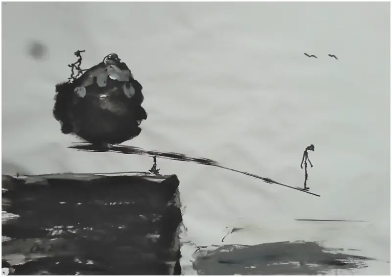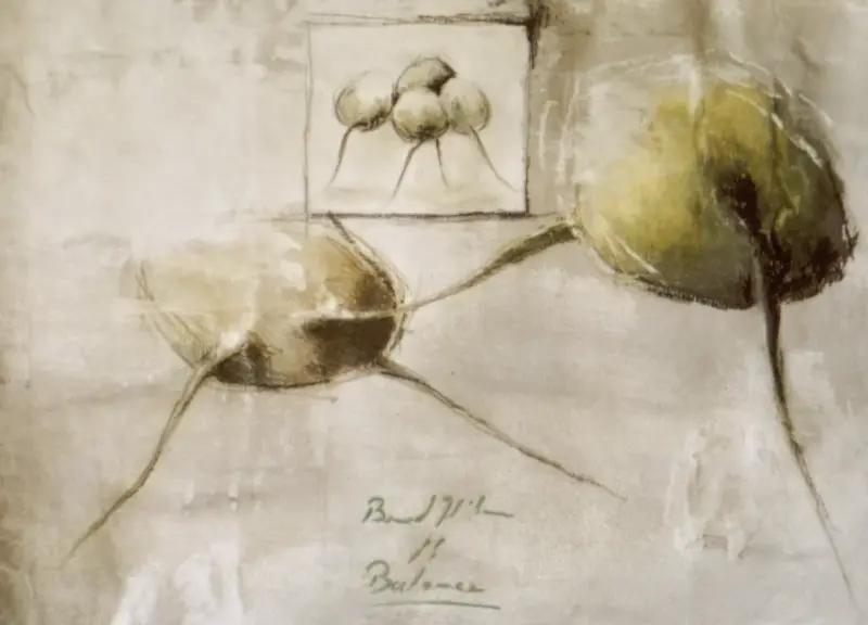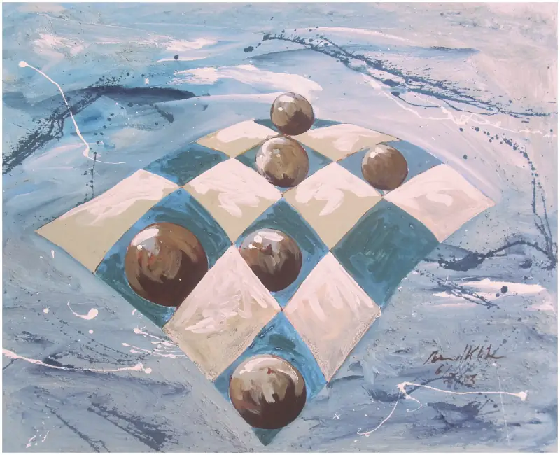Ein Gedanke der abstrakten Malerei besagt, dass Form und Farbe so gestaltet werden sollten, das unser Gehirn keinerlei Erinnerungen beim Betrachten des Werkes an irgendeiner figürlichen oder räumlichen Situation entdecken kann. Bei der unten gezeigten Serie wurde dieser Ausgangspunkt von mir willentlich ausgeblendet. Der Titel dieser Serie unterstütz diese geistige Einengung: „Objekte der Balance“. Große Körper müssen sich gegenseitig stützen sonst fallen sie um.